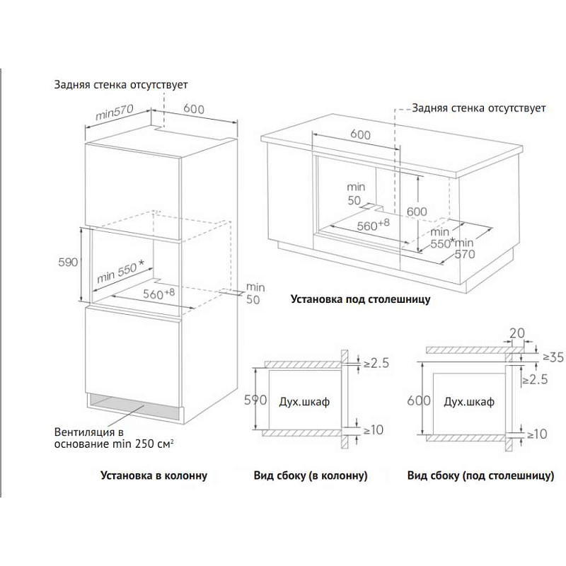 Прибор размещается в нише, размеры которой указаны в схеме установки. Материалы кухонной мебели должны быть термостойкими (>75⁰С). Для лучшей циркуляции воздуха используйте кухонный шкаф, дно которого короче боковых стенок, по возможности устраните заднюю стенку кухонного шкафа. Расстояние между верхней частью прибора и нижней частью рабочей поверхности должно быть не менее 10 мм и не закрыто планками или уплотнителями. После установки убедитесь, что прибор надежно закреплен.