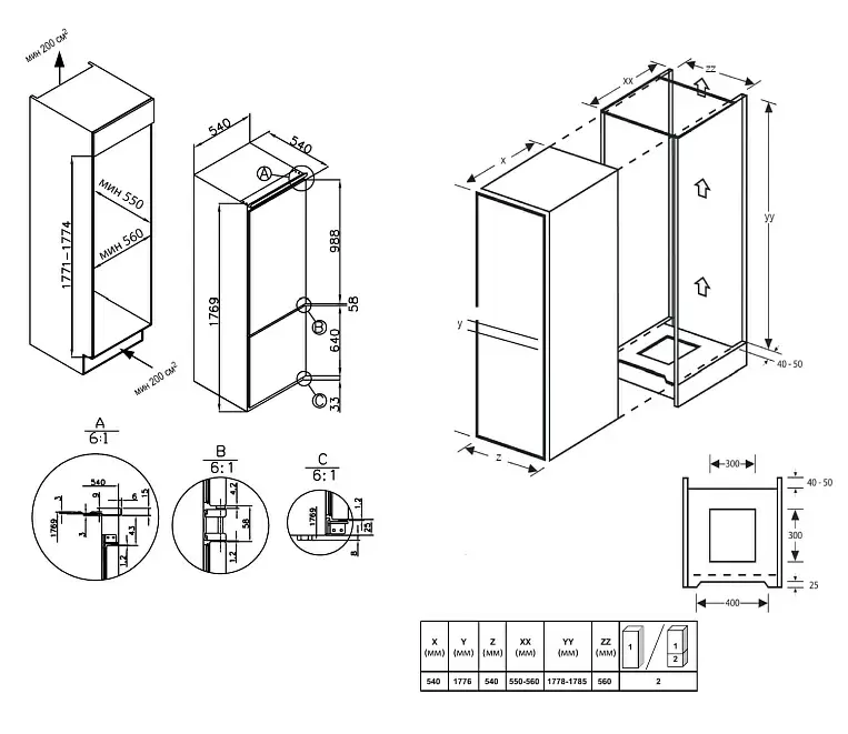Размеры встраивания (ШхГxВ): 560х550x1771-1774 мм