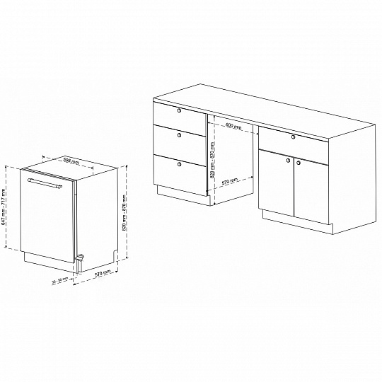 Ниша для установки выбирается согласно размерам прибора, указанным в инструкции. Выбор фасада и отверстий для его крепления должны быть основаны на шаблоне, входящем в комплект поставки. Для веса фасадов установлены примерные значения веса: (45 см) – мин. 3,5 кг, макс. 5 кг; (60 см) – мин. 5 кг, макс. 7 кг. Настройка высоты производится с передней стороны прибора путем регулировки уровня двух передних и одной задней ножки. Место размещения прибора рекомендуется выбирать в непосредственной близости от источников залива и слива воды. Залив воды происходит через защищенный шланг с автоматическим клапаном, подводку рекомендуется выполнять из таких же прочных и надёжных материалов. Слив воды необходимо выполнить с загибом шланга, чтобы исключить вероятность возврата воды в камеру. Все встраиваемые приборы имеют полную защиту от протекания воды.